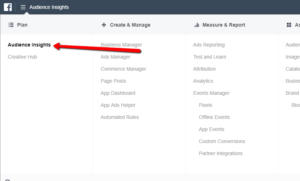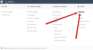 - Löydä kohdeyleisötiedot: Facebook Audience ja Audience Insights ovat hallintapaneelin kaksi eri osiota. Aloitetaan Yleisöt-välilehdestä. Siirry ensin Facebook-tilillesi ja avaa sitten Ads Manager -sivu. Napsauta vasemmassa yläkulmassa olevaa avattavaa painiketta. Valitse yleisö Kohteet-kohdasta