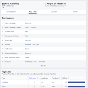 Jos et näe mitään tietojasi, siirry Avaa-painikkeeseen löytääksesi oikean yleisön. Napsauta Sivun tykkäykset -välilehteä nähdäksesi minkä tyyppisiä sivuja kaksoisolentokohderyhmäsi asiakkaat käyvät läpi. Voit jopa saada kunkin tuotemerkkisivun osuvuuden erittelemään tarkalleen missä suurin osa asiakkaastasi tekee ostoksia.