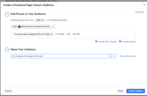 - Valitse haluamasi sivu kriteeriesi kanssa. Voit esimerkiksi luoda yleisön sivun sitoutumisen perusteella viimeisen vuoden aikana. Nimeä sen jälkeen yleisösi ja napsauta Luo yleisö -painiketta.